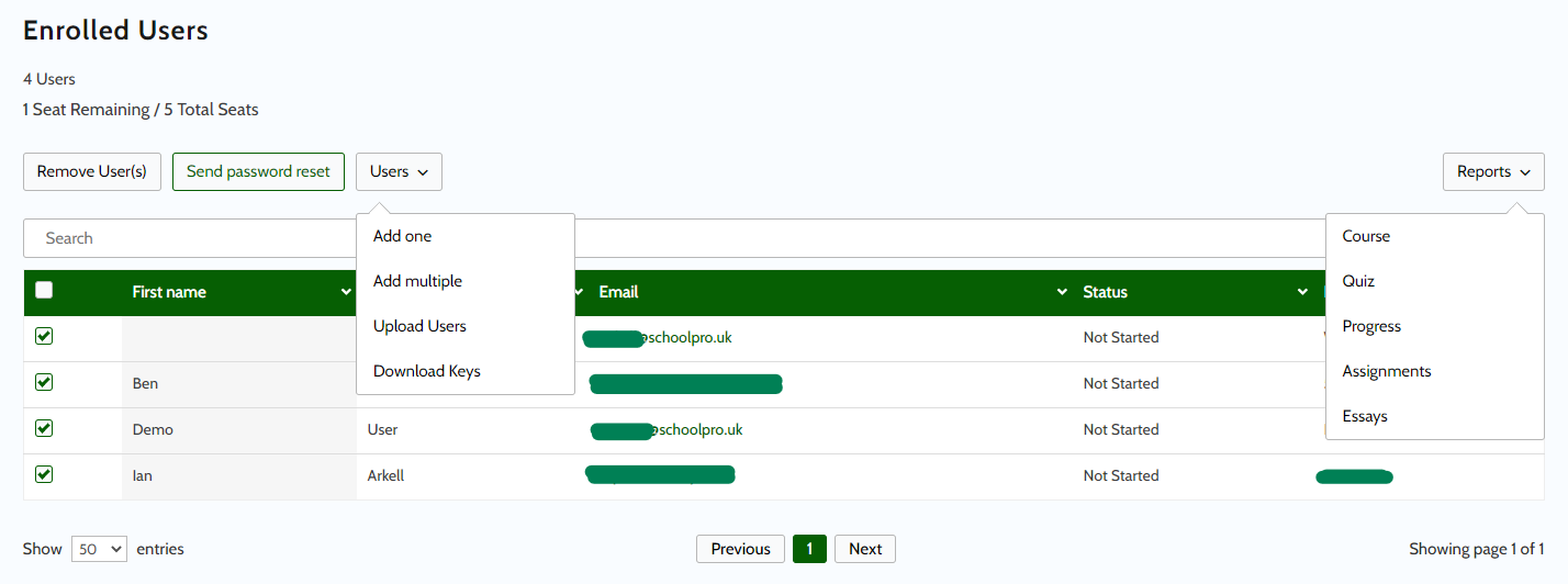 Once one or more users are selected, the ‘Send password reset’ button appears. Click on the button and the user or users will receive a fresh password reset email with a link to the site. Ideal for those staff that can’t find their welcome email or are having login troubles. - Reporting tools for course progress are now fully operational and can be seen in the drop down menu on the right hand side.