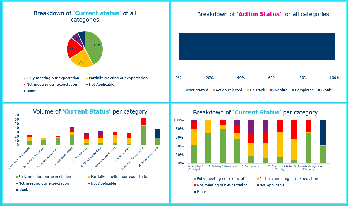 Adapted from the ICO’s own tool to better fit schools and Trusts, the tracker identifies how your organisation meets the ICO’s expectations in line with the accountability framework. This is identified as a RAG rating across the 10 areas of the framework and then allows you to develop an action plan to work towards meeting expectations in those areas identified as amber or red. The 10 areas of the accountability framework are: