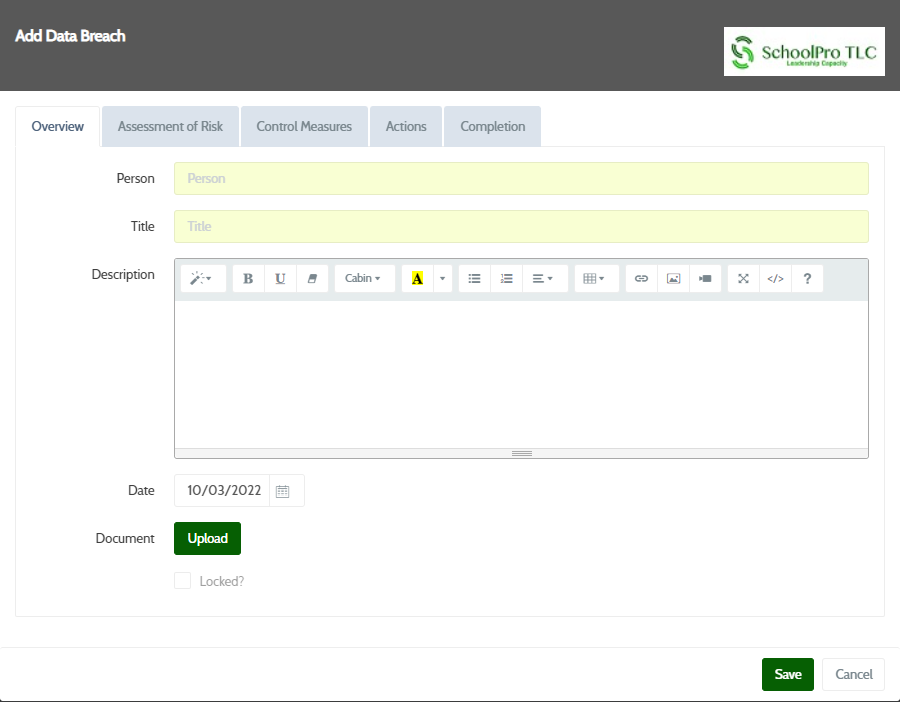 As well as having their own sections just like the old portal, you can also quickly add breaches, SARs and data decisions straight from the dashboard. Click the button at the top of the screen and fill in the new pop up window that appears.