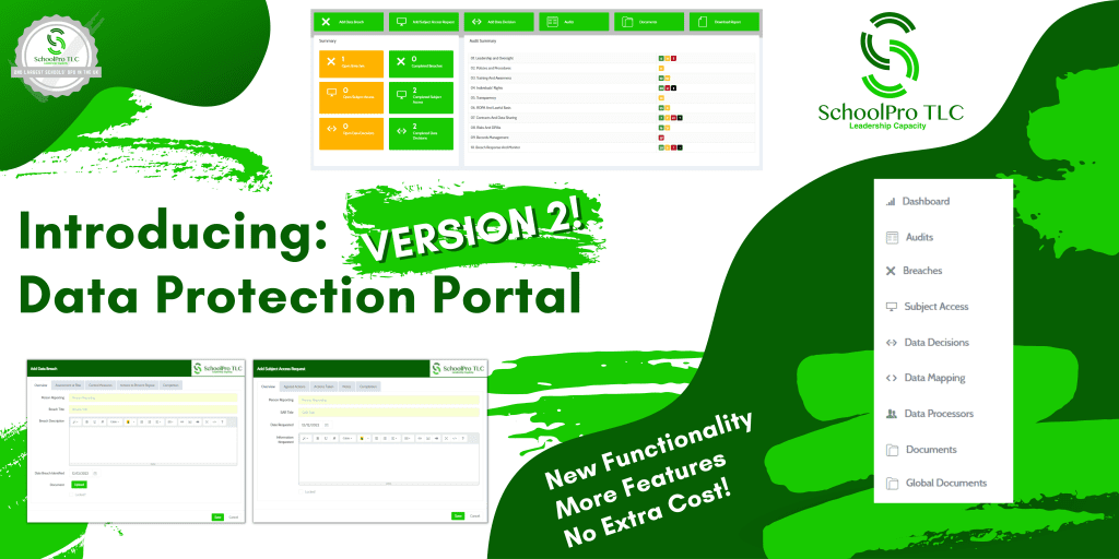 SchoolPro TLC announcement for the upgraded Version 2 of our Data Protection portal for schools and education establishments. New functionality, more features, no extra cost! Read now!
